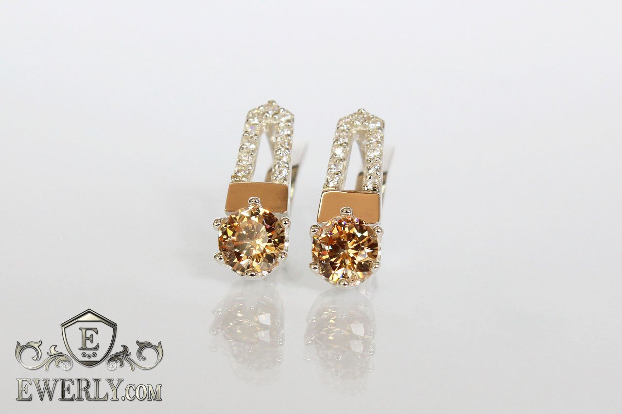 Серьги из серебра 925 пробы с золотыми пластинами 375 пробы с фианитами (цвет - шампань) для женщин.