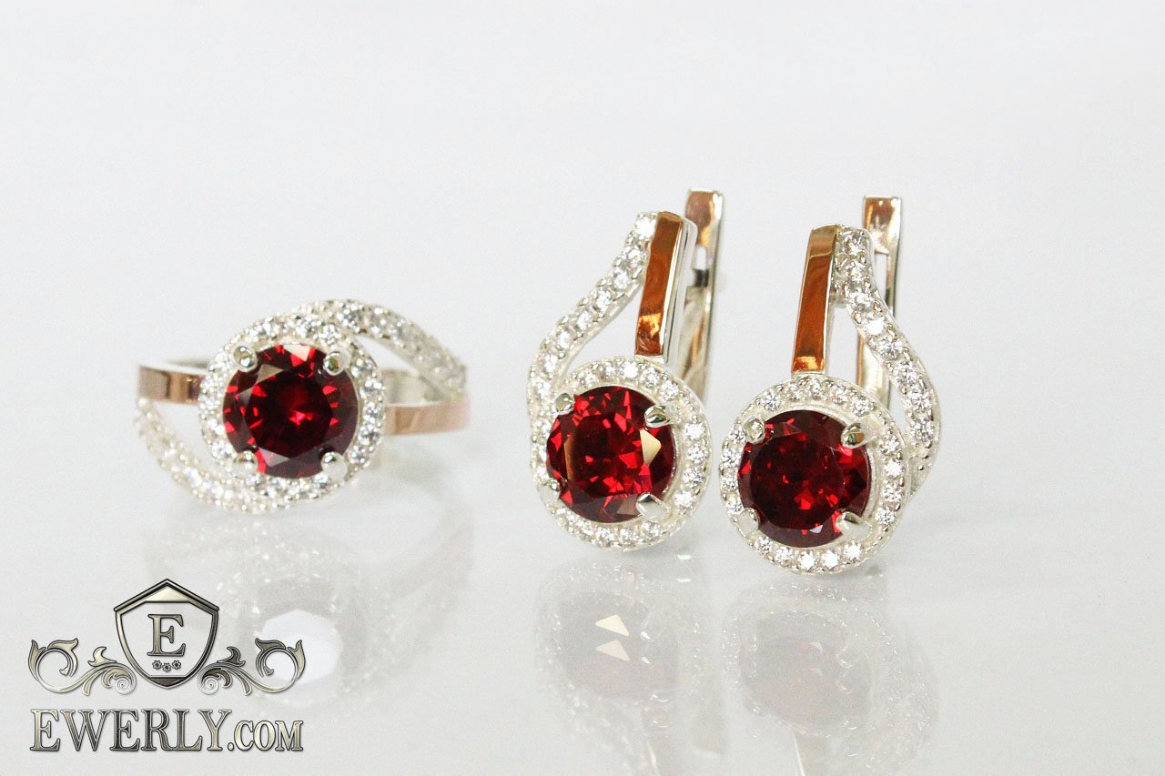 Женские серебряное кольцо и серёжки с золотыми вставками и красными камнями - фианитами гранатового цвета.