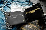 Полностью выполнен из натуральной кожи и металлических заклепок. Мужкое портмоне чёрного цвета ручной работы с надписью "BAD MOTHER FUCKER", в зависимости от контекста может нести разные смысловые значения, как "Плохой ублюдок", "Ох*енный пацан". Рисунок нанесён на кожу с помощью лазера (лазерная гравировка). Кошелёк имеет эффект потёртости и лёгкой небрежности. Изготовлен в ограниченном выпуске.