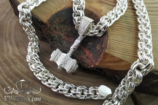 На фото показаний срібний ланцюг "Бісмарк" з підвіскою "Молот Тора" зі знаком Сварога. Дану підвіску з ланцюжком із срібла можна практично в будь-яких розмірах. З будь-яких питань звертайтесь на наші контакти.